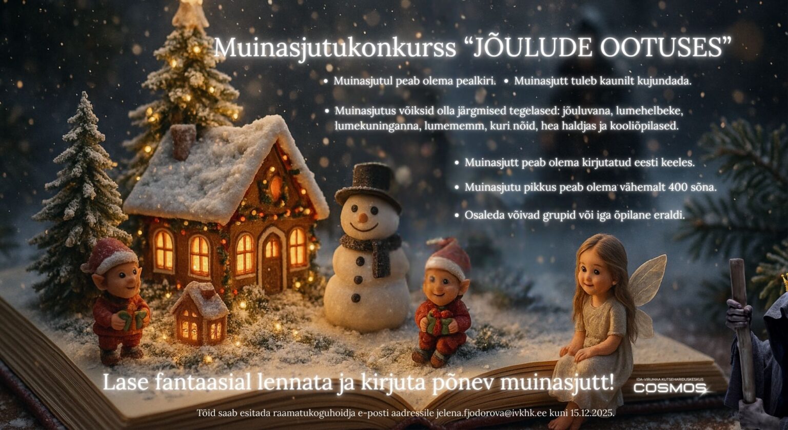 Ida-Virumaa Kutsehariduskeskus kutsub õppijaid osa võtma muinasjutukonkursist “Jõulude ootuses”. Konkursile oodatakse originaalseid ja kaunilt kujundatud muinasjutte, kus võivad seigelda jõuluvana, lumehelbed, lumekuninganna, lumememm, haldjad, kooliõpilased ja kuri nõid.