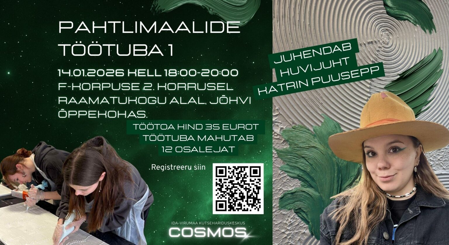 Töötuba toimub 14. jaanuaril 2026 kell 18.00–20.00 Jõhvis, F-korpuse 2. korrusel (raamatukogu ala). Töötuba juhendab Katrin Puusepp ning kõik vajalikud materjalid on kohapeal olemas.